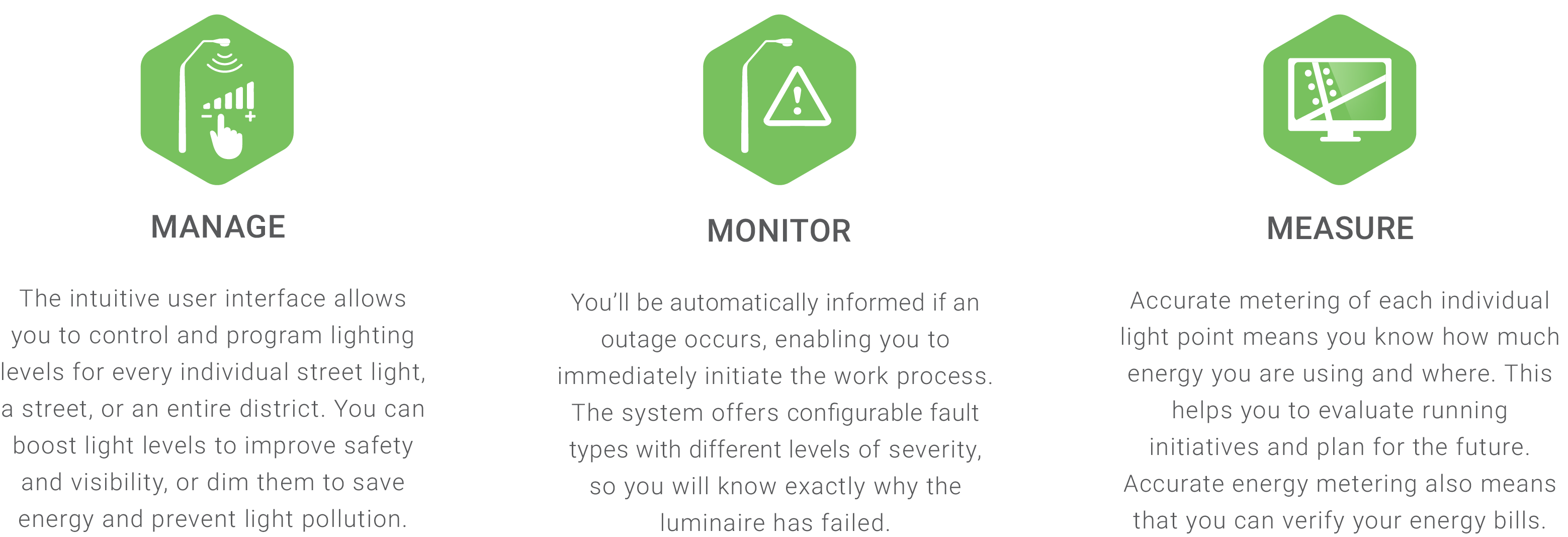 Lets you manage all connected street lights securely and remotely through a real-time, map-based view using any standard web browser.